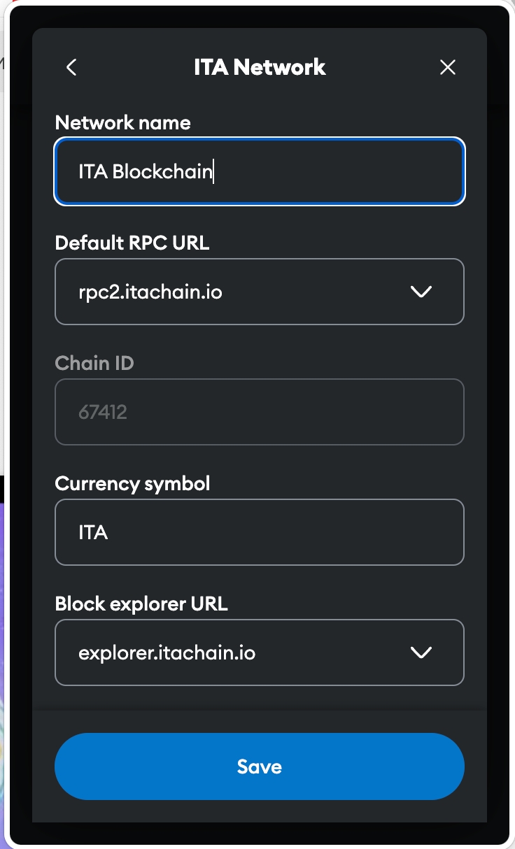 Click "Save" to complete the setup. The ITA Blockchain network will now appear in your MetaMask.